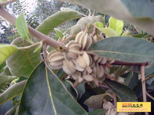 花灰绿。色,下垂,芳香,密被灰白色星状绒毛;常1-3(-5)花簇生幼枝叶腋;花梗被星状柔毛,长3-4毫米;萼筒钟状,长5毫米,在子房上骤收缩,裂片近三角形或近披针形,长3.5-4毫米,顶端渐尖或钝尖,内面疏生白色星状柔毛,包围子房的萼管短矩圆形或近球形,被星状绒毛和鳞片,具明显的8肋;雄蕊4,花药椭圆形,长1.6毫米;花柱直立,上部稍弯曲,下部密生绒毛。果实近圆形或阔椭圆形,长13毫米,具明显的8棱脊,翅状,果肉棉质;果核纺锤形,栗褐色,内面具丝状棉毛;子叶肥厚,含丰富的油脂。花期4-5月,果期8-9月。
